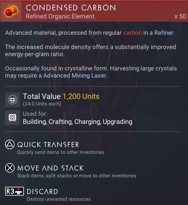 Verdichteter Kohlenstoff (C+) ist eine Ressource und eines der Treibstoff-Elemente.